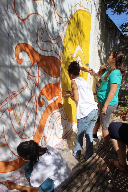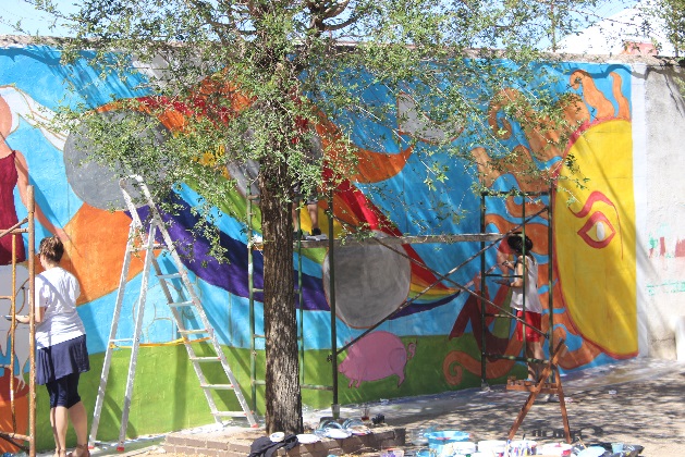 Ezekből a kisebb saját, csoportos tervekből alakult ki az a nagy közös terv mely végül magába foglalta mindenki személyes kis üzenetét, kiscsoportok üzenetét és azokat a szimbólumokat melyek a helyi lakosság számára értékkel bírnak. Számomra felemelő volt látni a közös alakulását, fejlődését. A nagy falfestmény tervezése is egyéni tervekkel vette kezdetét, melyeket szintén négy, ötfős csapatokban beszéltünk meg és raktunk össze eggyé. Ezek után a kiscsoportok együtt készítettek egy nagy közös tervet mely végül felkerült a falra. A közös és egyéni munkákat mindig csapatépítő, vagy önismeretet fejlesztő játékokkal indítottuk, zártunk melyek segítették az összehangolódást és vidámmá tették a munkát.