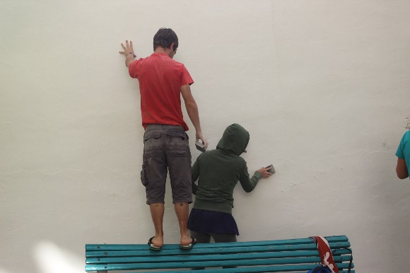 A legnagyobb munka, a falfestés volt. A közös terv kidolgozása után előkészítettük a falat, lecsiszoltuk majd fehérre festettük. Ezt követte a fal és a tervrajz beosztásának megrajzolása, pontos elkészítése. Miután a tervünk és a falunk egyformán négyzethálósak lettek kezdetét vette a terv felrajzolása a falra, majd a főbb vonalak megfestése.